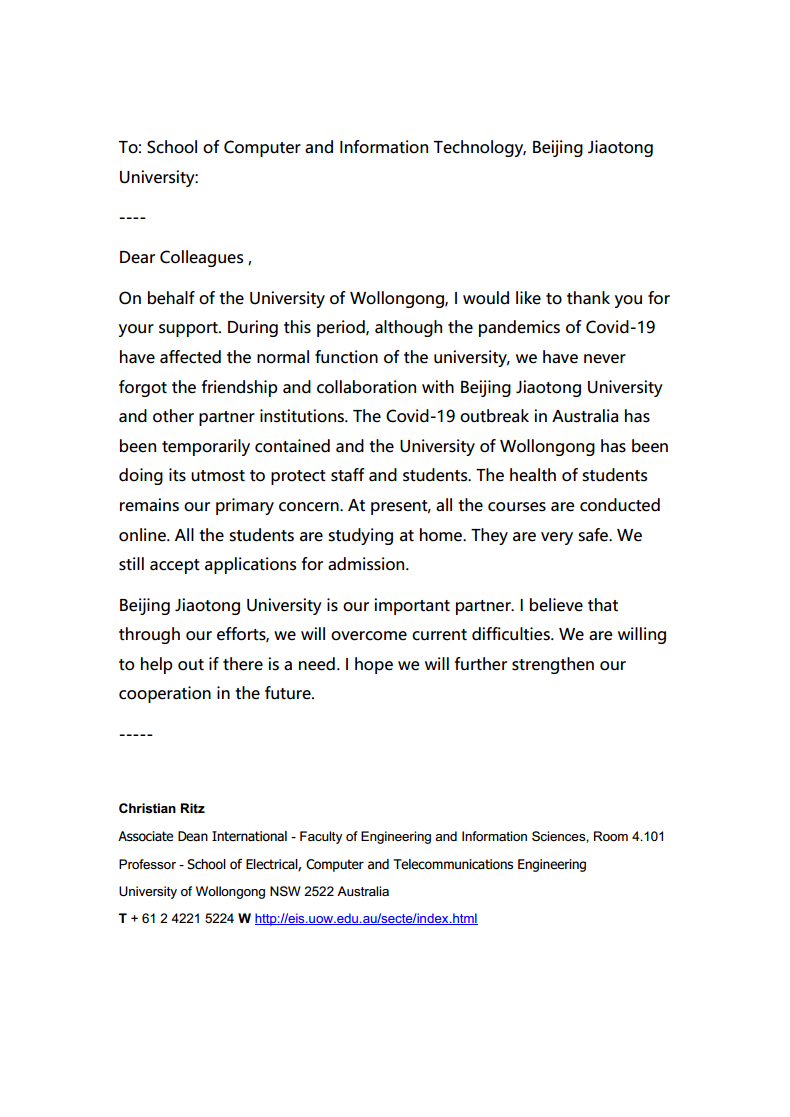 伍伦贡大学电子,计算机与电信工程学院副院长Christian Ritz教授在信中写到,“我代表伍伦贡大学,感谢您的支持。这段时间,尽管新冠肺炎已经影响了BEAT365的基本运转功能,但我们从未忘记和BEAT365英国官网的友谊和合作”,“BEAT365英国官网是我们的重要合作伙伴。我相信我们可以共渡难关,如果贵校需要任何帮助,我们一定伸出援手。我希望在未来进一步加强双方合作”。伦敦城市大学副校长Stanton Newman教授在信中写到,“我代表伦敦城市大学向您表示深深的感谢,您慷慨捐赠的口罩不仅向奋战在抗击新冠肺炎一线的工作人员提供了宝贵的个人防护物资,更是重申了我们国际合作关系的重要性和价值”,“我想特别感谢计算机学院的杨萌女士,她和我的同事们多次沟通,最终将口罩顺利寄到了英国,在目前的情况下这不是一件容易的事”。