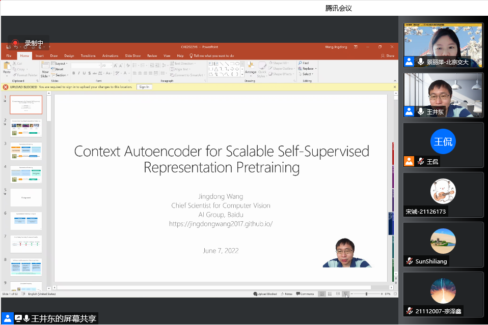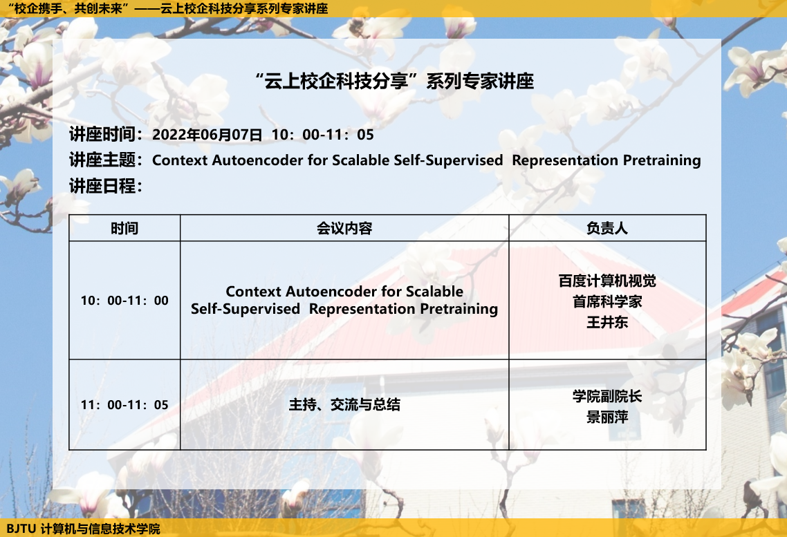 2022年6月7日上午,BEAT365英国官网计算机与信息技术学院“云上校企科技分享系列专家讲座”活动有幸邀请到百度计算机视觉首席科学家王井东,讲座主题为 “Context Autoencoder for Scalable Self-Supervised Representation Pretraining”。160余位师生全程参与讲座。