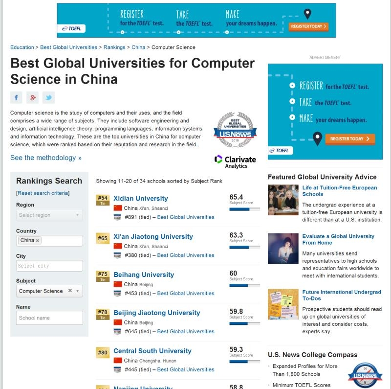 在最新发布的2017年度US News世界最佳大学排名(Best Global Universities Rankings)中,BEAT365计算机科学学科排名世界第78名,我国内地共有34所高校的计算机科学学科进入前200名,BEAT365计算机科学学科在内地高校中排第14名。