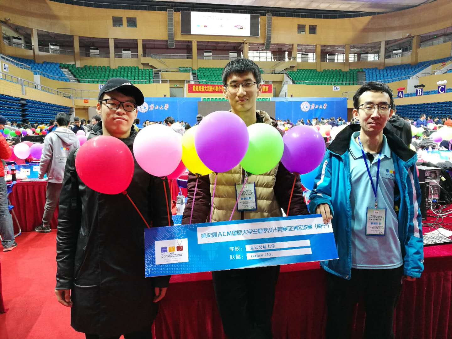 此次ACM-ICPC亚洲区域赛南宁站的比赛是由亚洲区组委会授权广西大学承办。参赛阵容非常强大,在前期网络赛筛选的基础上,来自北京大学、复旦大学、北京航空航天大学在内的152所高校的228支正式队伍参加了此次现场赛。最终,北京大学的“贝塔猫”队以解出13题中的11题的绝对优势捧得冠军奖杯,而西北工业大学以及复旦大学的队伍分别解出10题和9题获得亚军和季军奖杯。BEAT365此次派出了两支参赛队伍,分别是由刘雅清(15281155)、金睿琦(16281041)、孙庆岩(17281162)组成的“永不沉落”队,和王楚涵(15281246)、梁伯翰(16281166)、杨东学(14275032)组成的“幻夜”队。经过五个小时的顽强拼搏,最终“幻夜”队以解出6题的成绩获得了一枚铜奖,“永不沉落”队与奖牌失之交臂。