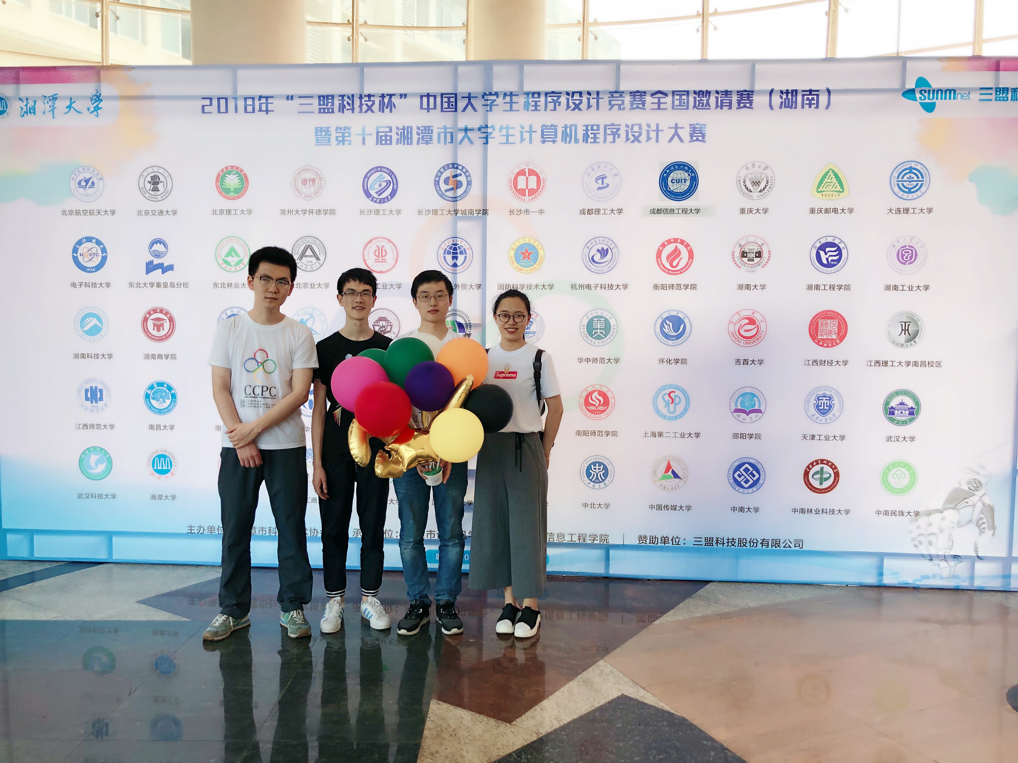 2018年第4届CCPC(中国大学生程序设计竞赛)全国邀请赛湘潭赛站于2018年5月12日-13日在湘潭大学举行。BEAT365派出参赛队伍——“猜歌群”队(何卫锋、郑黎明、王天舒)赴现场参赛。来自全国60所高校的177支队伍展开激烈角逐。在本赛站的开幕式上,BEAT365ACM教练许华婷应邀代表参赛教练发言。湘潭市科学技术协会党组书记、主席涂敬阳,湘潭市人民政府秘书长刘定良,湘潭市科学技术协会副主席蒋长湘,湘潭市计算机学会理事长刘任任,湘潭大学副校长刘建平,湘潭大学科协秘书长许斌等出席闭幕式。