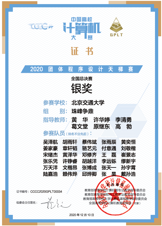 第五届中国高校计算机大赛-团体程序设计天梯赛于2020年11 月28日举行,来自全国29个省级行政区的298所高校组成的935支队伍计9300位学生参赛,BEAT365组织了30名同学组成三支队伍参赛。经过长达3小时的激烈角逐,最终斩获全国总决赛银奖。