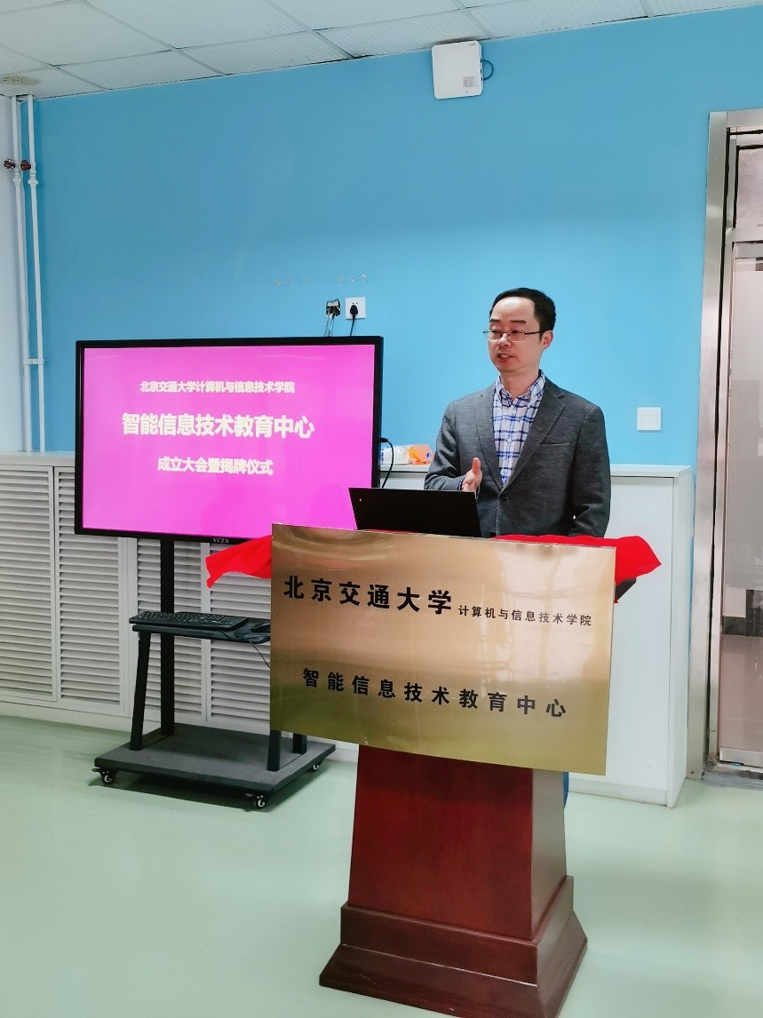 贾卓生宣布了学院成立“智能信息技术教育中心”和任命中心负责人的决定,并与中心主任李清勇一起,共同为中心揭牌。