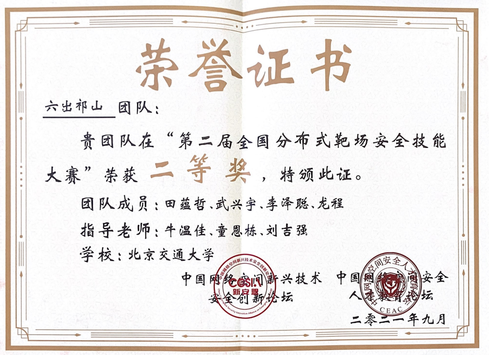 由鹏城国家实验室(副部级)、华中科技大学、武汉大学、四川大学、中电长城网际、中汽创智、宁波工业互联网研究院联合承办,方滨兴院士等专家参与指导的第二届基于全国分布式靶场的安全技能大赛于9月17日圆满落幕。BEAT365英国官网网络空间安全学科责任教授刘吉强老师领队、牛温佳和童恩栋老师指导的“六出祁山”队经过8小时的鏖战再获佳绩,以3665分夺得第二届分布式靶场安全技能大赛第二名,获得二等奖。
