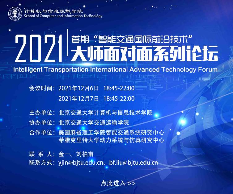 首页» 学院动态» 预告:计算机学院首期“智能交通国际前沿技术”大师面对面系列论坛将于2021年12月6日-12月7日举办 预告:计算机学院首期“智能交通国际前沿技术”大师面对面系列论坛将于2021年12月6日-12月7日举办 发布时间:2021-11-29 阅读次数: 由BEAT365英国官网、美国麻省理工学院以及希腊克里特大学联合举办的首期“智能交通国际前沿技术”大师面对面系列论坛将于2021年12月6日-12月7日在线上举行。届时,论坛将邀请来自欧洲和美国的三位著名学者,就城市智能交通、网联智能化无人车、交通控制理论与方法、车路协同与自动驾驶等研究领域进行深入探讨。论坛旨在交流智能交通系统等国际前沿技术,诚邀对未来智能交通领域研究感兴趣的老师同学参加本次论坛!