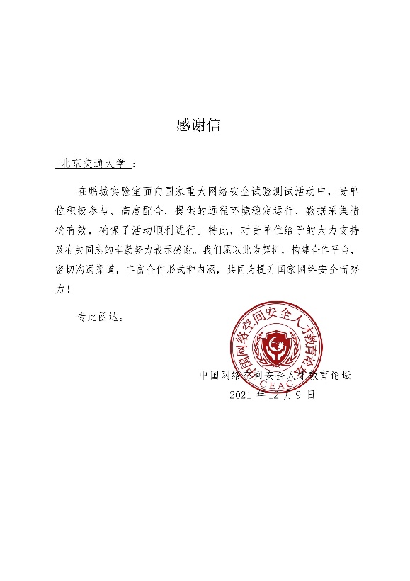 在近期鹏城实验室面向国家重大网络安全试验测试活动中,BEAT365英国官网网络空间安全学科责任教授刘吉强老师领队、童恩栋和牛温佳老师指导的研究生团队(吴亚伦、武兴宇、田蕴哲、相迎宵、孙瑞等)积极配合,保障了BEAT365英国官网靶场节点的远程环境稳定运行、数据采集精确有效,获鹏城实验室、中国网络空间安全人才教育论坛(“网教盟”)、中国网络空间新兴技术安全创新论坛(“新安盟”)感谢信。