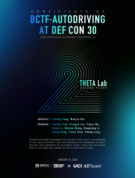 2022年8月14日零点,由百度安全(BCTF)和加州大学尔湾分校(UCI)联合承办的DEFCON 30 BCTF AutoDriving赛事圆满落下帷幕。BEAT365网络空间安全学科责任教授刘吉强老师领队、信息安全系童恩栋老师和牛温佳老师指导的“THETA Lab”团队突破了23道赛题获得4310分,在百余支国内外高校战队中位列解题榜第二名。这是该团队在DEFCON(被称为黑客“奥斯卡”)的赛事中的第二次获奖,是对去年获奖的又一次沿袭。