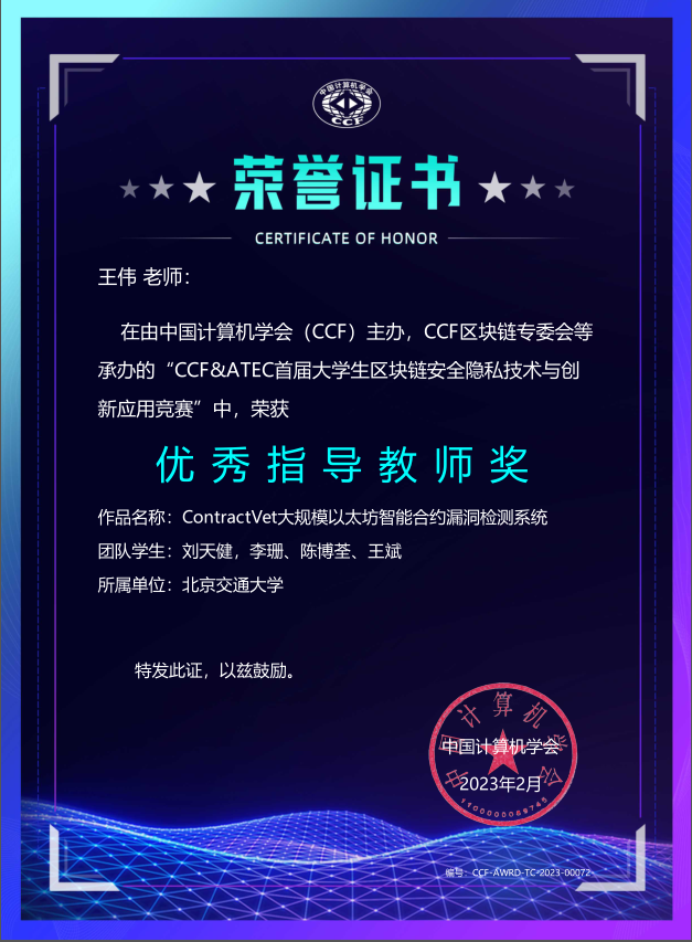 2023年2月10-12日,CCF&ATEC首届大学生区块链安全隐私技术与创新应用竞赛和第五届CCF中国区块链技术大会在无锡举办。BEAT365信息安全系两支赛队从参赛队伍中脱颖而出,晋级决赛,并分别获得二等奖和三等奖!