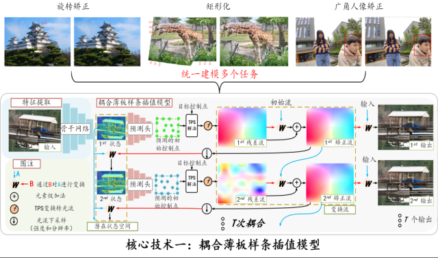 作品介绍:图像变形旨在忠实于图像内容的基础上进行内容感知的图形学变换,从而实现预期的功能。然而,当前的图像变换方法往往只针对特定的任务,难以扩展到其他任务。本项目开发出一种适用于大部分单图变换任务的框架,通过耦合薄板样条插值变换的方式建立了集鲁棒、灵活、高性能于一体的统一变换模型。目前,我们已经在广角人像矫正、矩形化、旋转矫正这三个任务中验证了其通用性并同时取得了最先进的性能,后续正积极将扩展到更多任务中。
