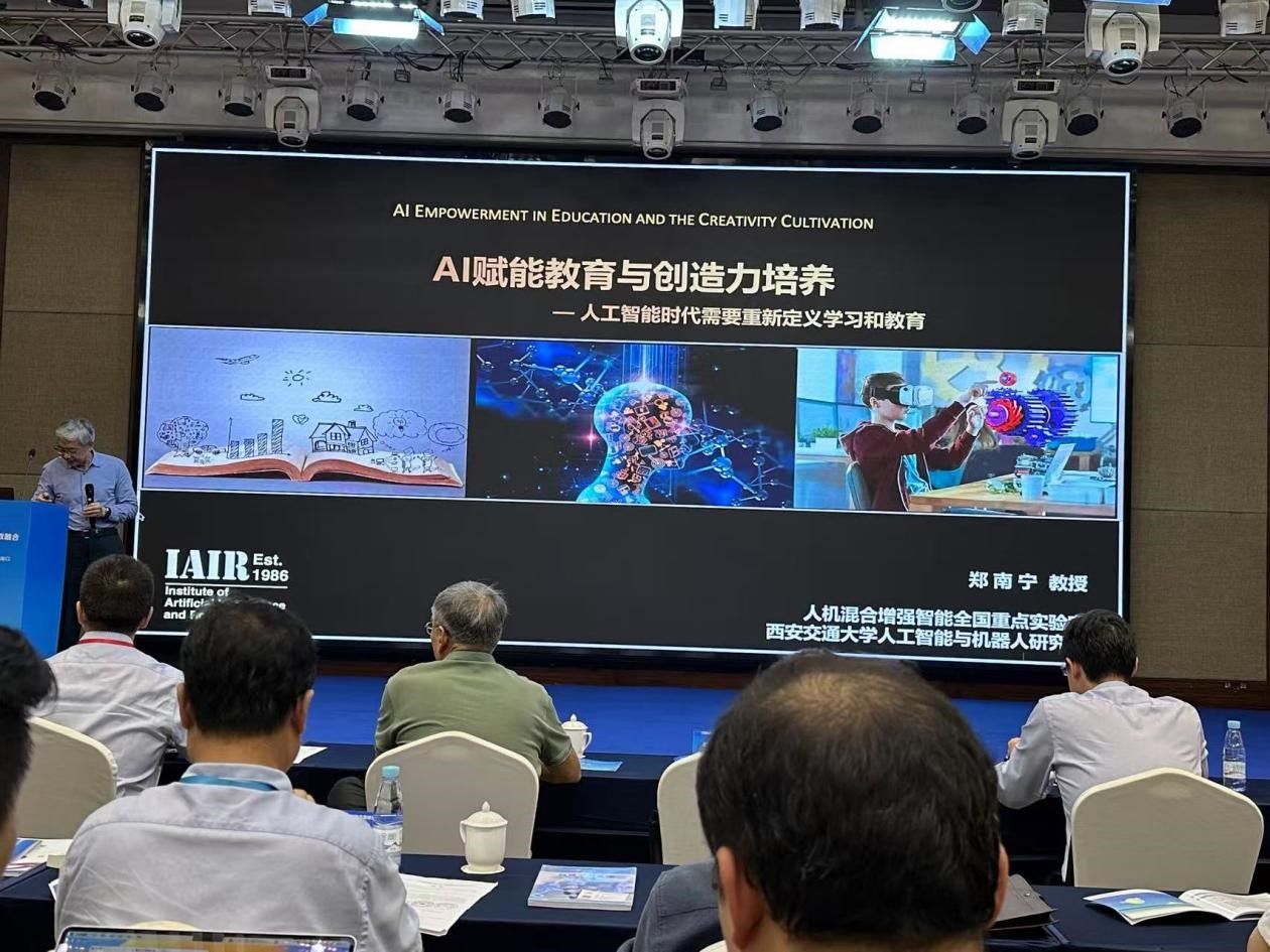 本次论坛特别邀请了西安交通大学人工智能与机器人研究所的郑南宁院士及其团队成员参会。首先,郑南宁院士发表了题为“AI赋能教育与创造力培养”的大会报告,系统分析了人类智能的本质和边界、人工智能如何激发人类的创造力、人工智能的局限性以及ChatGPT给“学习”和“教育”带来的思考。他指出,人工智能学科发展迅速、技术迭代频繁,为了培养适应产业需求的复合型人才,人工智能课程设置应紧跟时代步伐、不断优化。