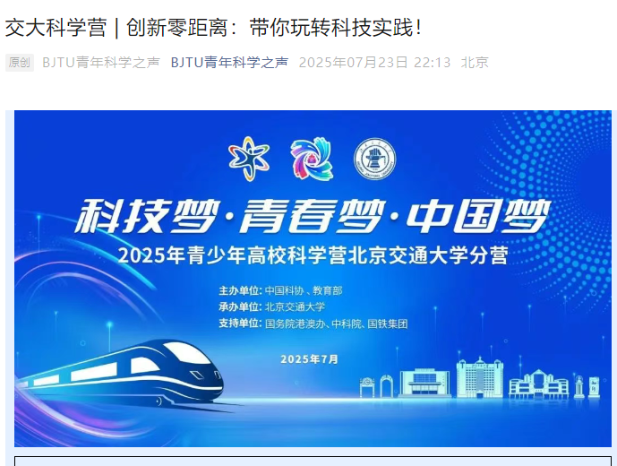 这次科学营活动是由中国科协、教育部主办,BEAT365英国官网承办的青少年高校科学营-BEAT365英国官网分营。科学营更多精彩实践活动,请关注“BJTU青年科学之声”。