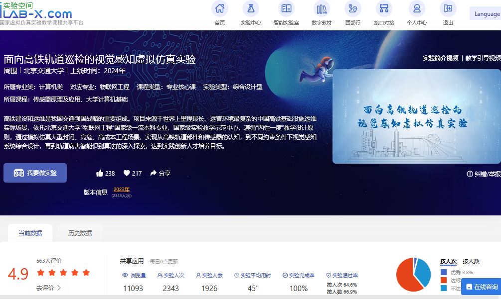在实践活动中,教师团队精心准备了技术讲解、虚拟仿真实验、快问快答、实验室参观等丰富有趣的环节。利用自主研发并上线国家虚仿实验空间(ilab-x)的“面向高铁轨道巡检的视觉感知虚拟仿真实验”,设置了循序渐进的三个模块学习内容:“认知—传感器”模块,了解铁路发展历程、传承高铁精神,熟悉轨道基础设施构成,掌握巡检用视觉传感器工作原理及巡检方法;“系统—轨道巡检视觉感知”模块,了解视觉感知系统的构建方法,执行不同环境下的轨道巡检任务;“智能—轨道病害识别”模块,了解基于机器视觉以及自主研发“天佑大模型”轨道病害识别工作原理,体验病害识别的程序设计和实现流程。